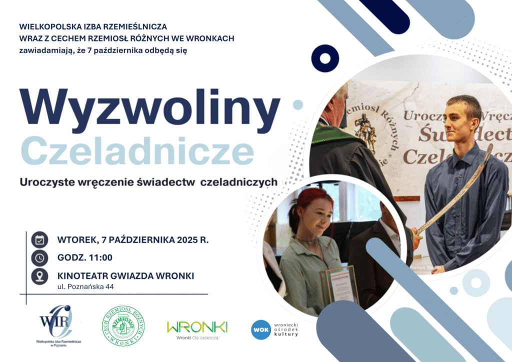 WIELKOPOLSKA IZBA RZEMIEŚLNICZA wraz z CECHEM RZEMIOSŁ RÓŻNYCH WE WRONKACH zawiadamiają, że 7 października odbędą się Wyzwoliny Czeladnicze.