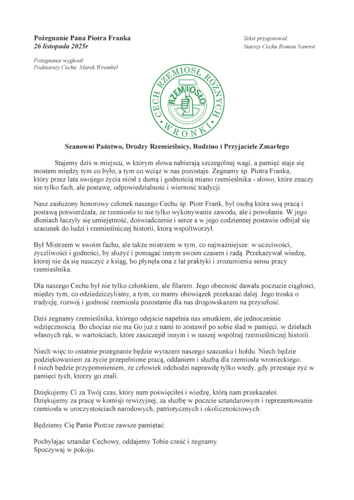 W środę 26 listopada 2025 roku pożegnaliśmy śp. Piotra Franka. Msza pogrzebowa odbyła się w kościele farnym pw. św. Katarzyny we Wronkach, a ceremonia na cmentarzu komunalnym we Wronkach.